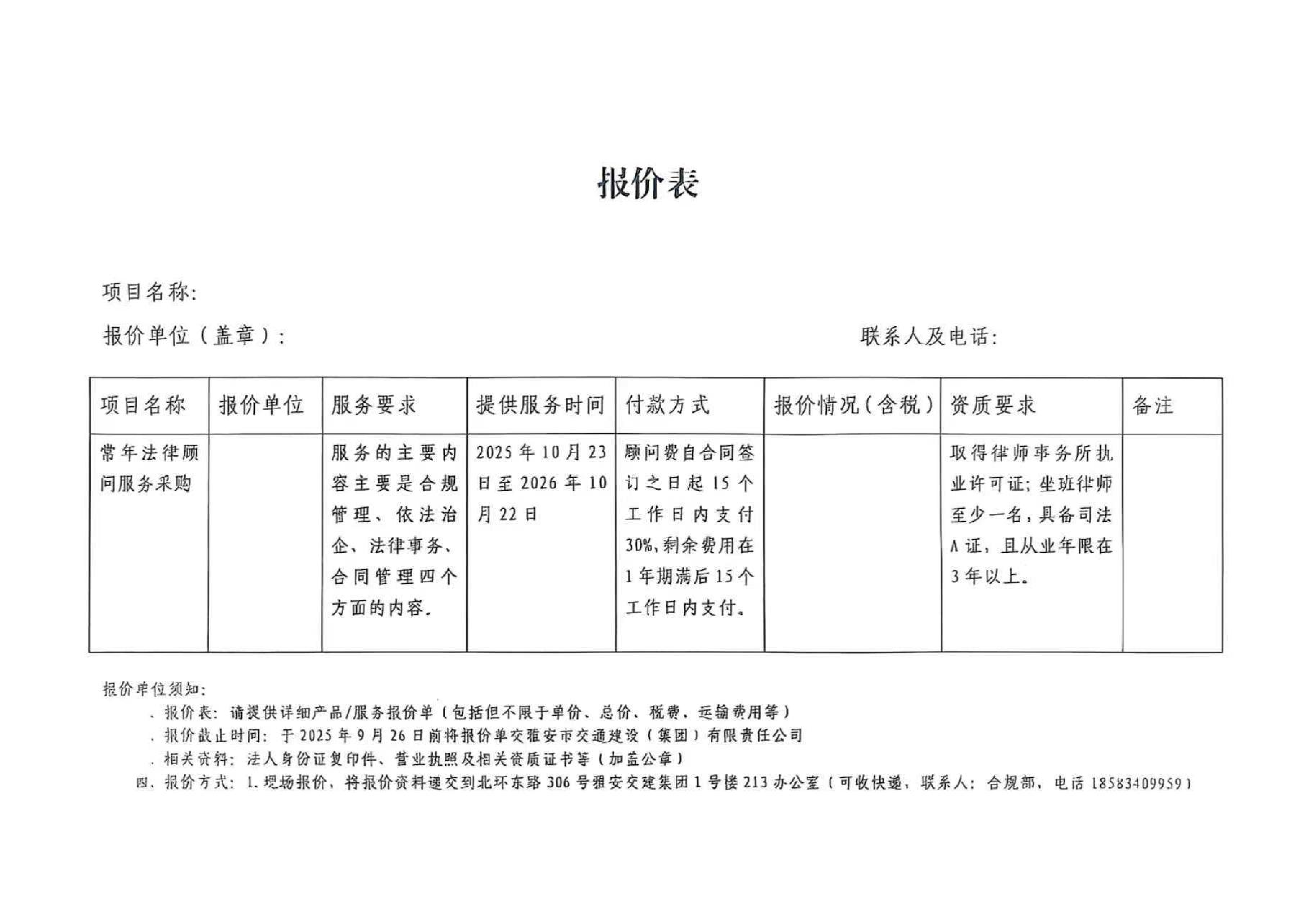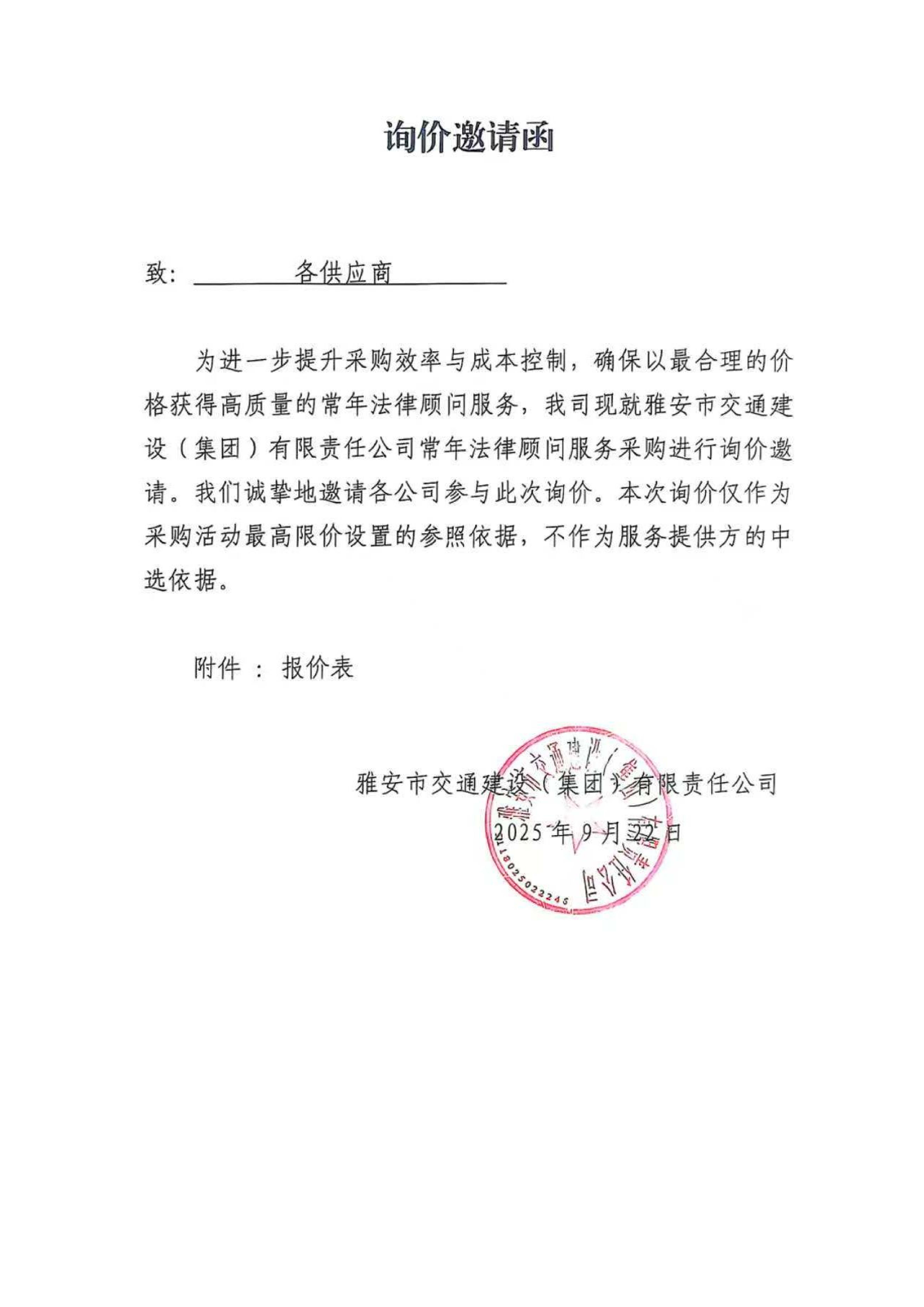 關(guān)于雅安市交通建設(shè)(集團)有限責任公司常年法律顧問服務(wù)的詢價函