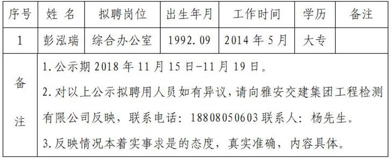 雅安交建集團工程檢測有限公司擬聘用人員公示