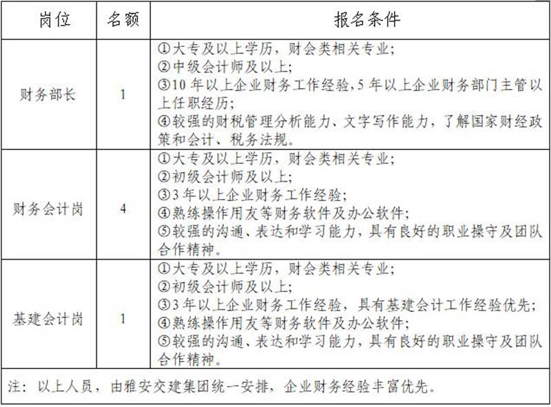 根據發(fā)展需要,決定面向社會公開招聘雅安市交通建設(集團)有限責任公司(以下簡稱“雅安交建集團”)所屬子公司財務部門負責人1名,工作人員5名,現將有關事項公告如下: