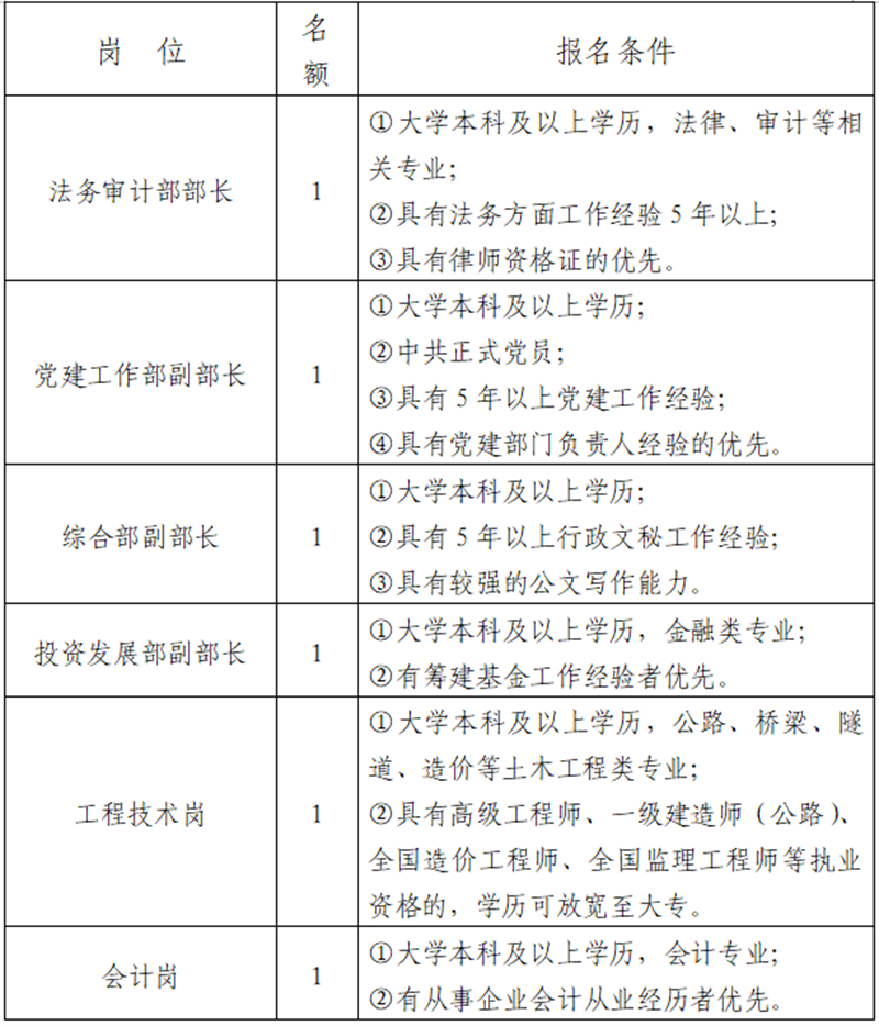 雅安市交建集團(tuán)是市屬重點(diǎn)國(guó)有企業(yè),主要從事交通基礎(chǔ)設(shè)施及配套服務(wù)設(shè)施的投資、建設(shè)、經(jīng)營(yíng)和交通資源的開發(fā)利用等業(yè)務(wù)。根據(jù)公司發(fā)展需要,決定面向社會(huì)公開招聘6名工作人員,現(xiàn)將有關(guān)事項(xiàng)公告如下: