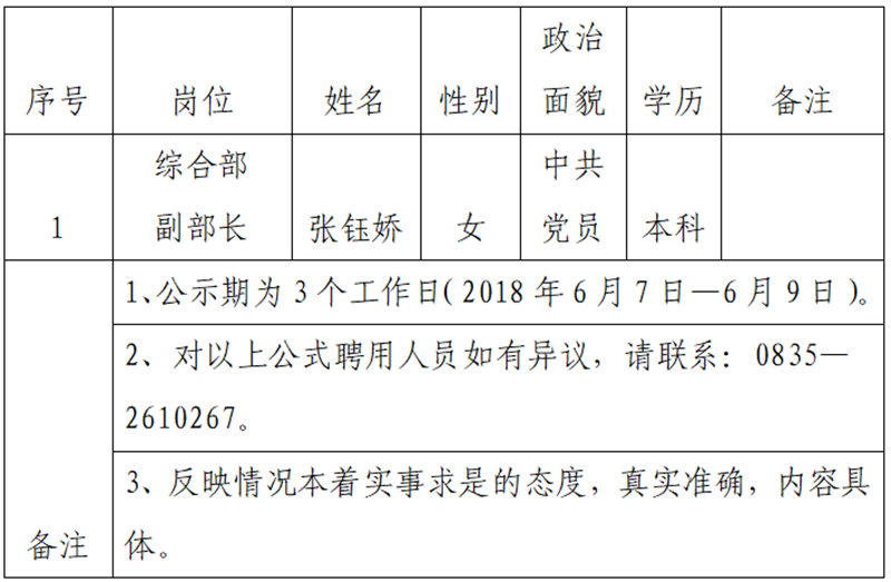 根據(jù)雅安市交通建設(shè)(集團(tuán))有限責(zé)任公司人才選聘實(shí)施辦法(試行)第十四條的規(guī)定:黨政機(jī)關(guān)事業(yè)單位人員選拔程序,以組織選拔方式進(jìn)行,主要是溝通推薦、組織考察、會(huì)議研究、任前公示、研究聘用。雅安交建集團(tuán)平順檢測有限公司研究確定以下1名擬聘用人員,現(xiàn)公示名單如下: