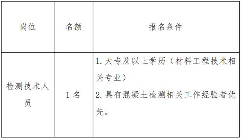 雅安交建集團(tuán)康居建設(shè)工程質(zhì)量與室內(nèi)環(huán)境污染檢測(cè)有限公司是雅安市交通建設(shè)(集團(tuán))有限責(zé)任公司下屬子公司,主要從事民用建筑室內(nèi)環(huán)境污染檢測(cè)業(yè)務(wù)。現(xiàn)根據(jù)公司業(yè)務(wù)發(fā)展需要,擬向社會(huì)公開(kāi)招聘1名技術(shù)檢測(cè)人員,現(xiàn)將有關(guān)事項(xiàng)公告如下: