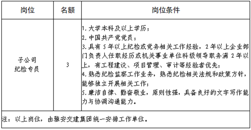根據(jù)發(fā)展需要,決定面向社會公開招聘雅安市交通建設(shè)(集團(tuán))有限責(zé)任公司(以下簡稱“雅安交建集團(tuán)”)所屬子公司紀(jì)檢專員3名,現(xiàn)將有關(guān)事項公告如下: