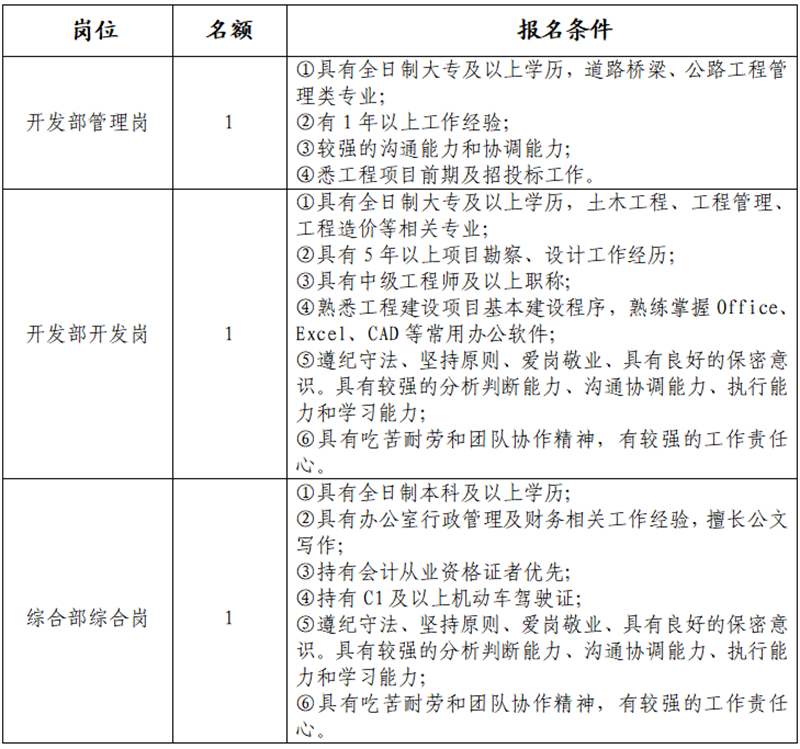 雅安交建集團大興交通開發(fā)有限公司是雅安市重點國有企業(yè)雅安市交建集團下屬子公司,主要從事交通基礎設施及服務設施投資、建設開發(fā);土地整理;房地產(chǎn)開發(fā);建筑材料生產(chǎn)、銷售;旅游開發(fā)等業(yè)務。根據(jù)公司發(fā)展需要,決定面向社會公開招聘3名工作人員,現(xiàn)將有關(guān)事項公告如下: