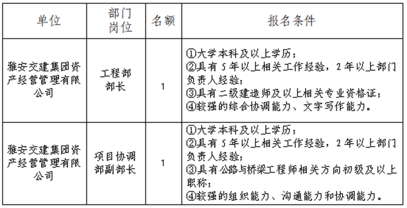 根據(jù)發(fā)展需要,決定面向社會(huì)公開(kāi)招聘雅安市交通建設(shè)(集團(tuán))有限責(zé)任公司(以下簡(jiǎn)稱“雅安交建集團(tuán)”)所屬子公司工作人員2名,現(xiàn)將有關(guān)事項(xiàng)公告如下: