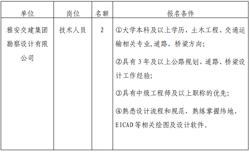 根據發(fā)展需要,決定面向社會公開招聘雅安市交通建設(集團)有限責任公司(以下簡稱“雅安交建集團”)所屬子公司工作人員2名,現將有關事項公告如下: