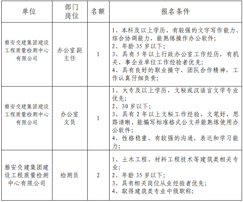 根據(jù)發(fā)展需要,決定面向社會公開招聘雅安市交通建設(shè)(集團(tuán))有限責(zé)任公司(以下簡稱“雅安交建集團(tuán)”)所屬子公司工作人員4名,現(xiàn)將有關(guān)事項公告如下: