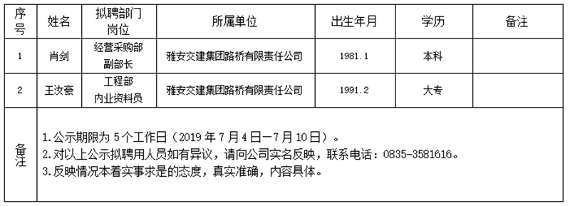 雅安交建集團子公司擬聘用人員公示(路橋公司)