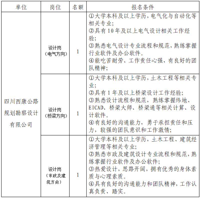 根據(jù)發(fā)展需要,決定面向社會(huì)公開(kāi)招聘雅安市交通建設(shè)(集團(tuán))有限責(zé)任公司(以下簡(jiǎn)稱(chēng)“雅安交建集團(tuán)”)所屬子公司專(zhuān)業(yè)技術(shù)人才3名,現(xiàn)將有關(guān)事項(xiàng)公告如下: