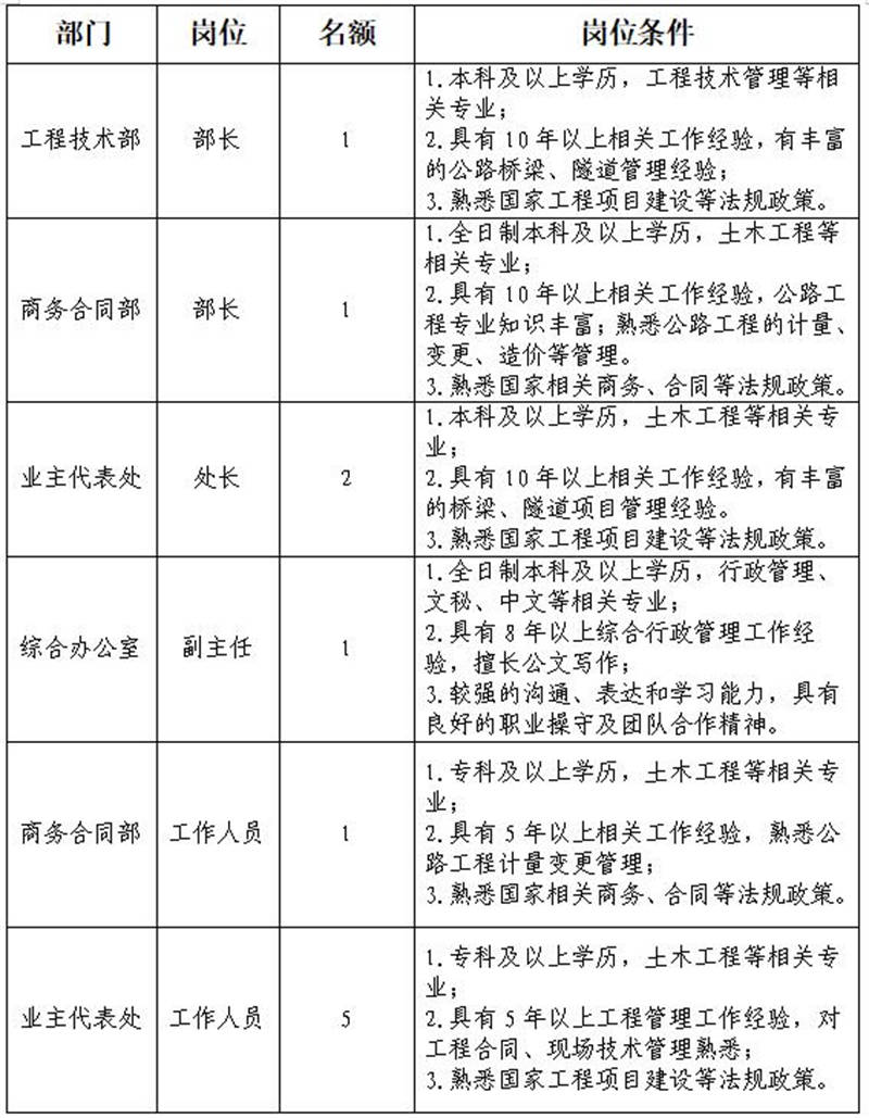 根據(jù)發(fā)展需要,決定面向社會公開招聘雅安市交通建設(shè)(集團)有限責任公司(以下簡稱“雅安交建集團”)所屬子公司管理人員及工作人員共計11名,現(xiàn)將有關(guān)事項公告如下: