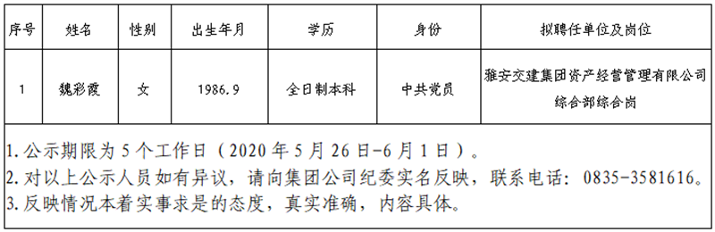 根據(jù)雅安市交通建設(shè)(集團(tuán))有限責(zé)任公司招聘公告,經(jīng)公開(kāi)報(bào)名、資格初審、筆試、面試、體檢考察等環(huán)節(jié),現(xiàn)將以下1名擬聘用人員予以公示: