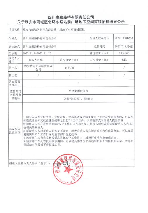 四川康藏路橋有限責(zé)任公司關(guān)于雅安市雨城區(qū)北環(huán)東路站前廣場(chǎng)地下空間商鋪招租結(jié)果公示
