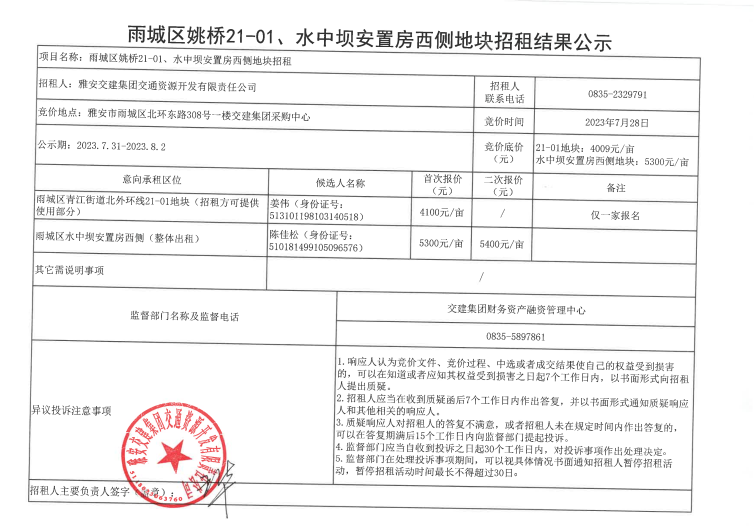 雅安交建集團交通資源開發(fā)有限責任公司關于雅安市雨城區(qū)姚橋21-01和水中壩塊塊招租結果公示