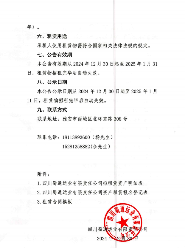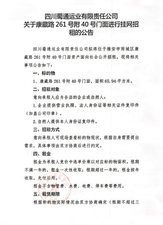 四川蜀通運(yùn)業(yè)有限責(zé)任公司 關(guān)于康藏路261號(hào)附40號(hào)門面進(jìn)行掛網(wǎng)招租的公告