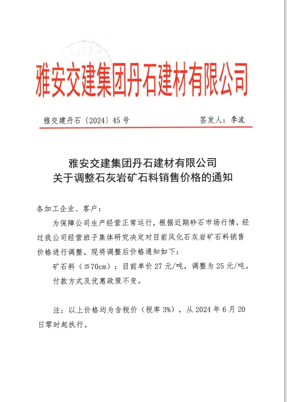 關(guān)于調(diào)整石灰?guī)r礦石料銷(xiāo)售價(jià)格的通知