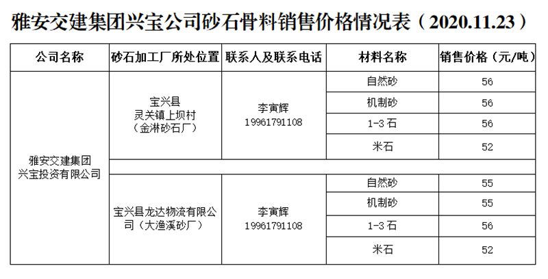 雅安交建集團(tuán)興寶公司砂石骨料銷售價(jià)格情況表(2020.11.23)