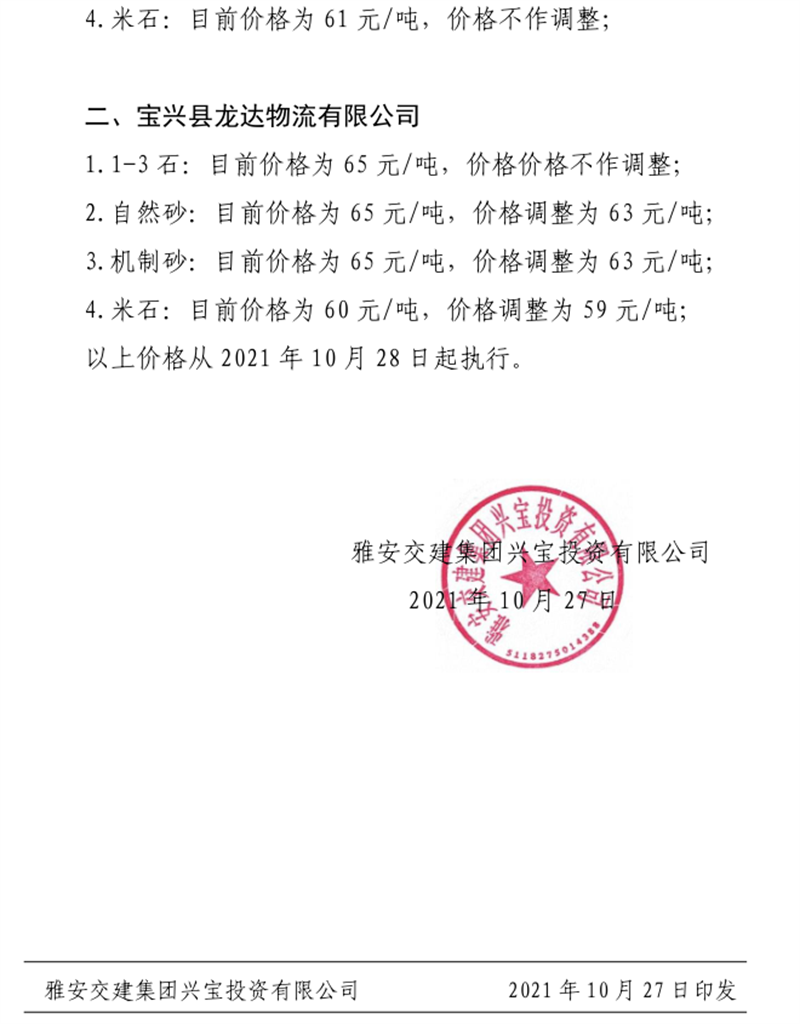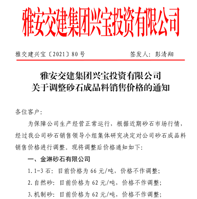 雅安交建集團(tuán)興寶公司關(guān)于調(diào)整成品料銷售價(jià)格的通知(2021.10.28)