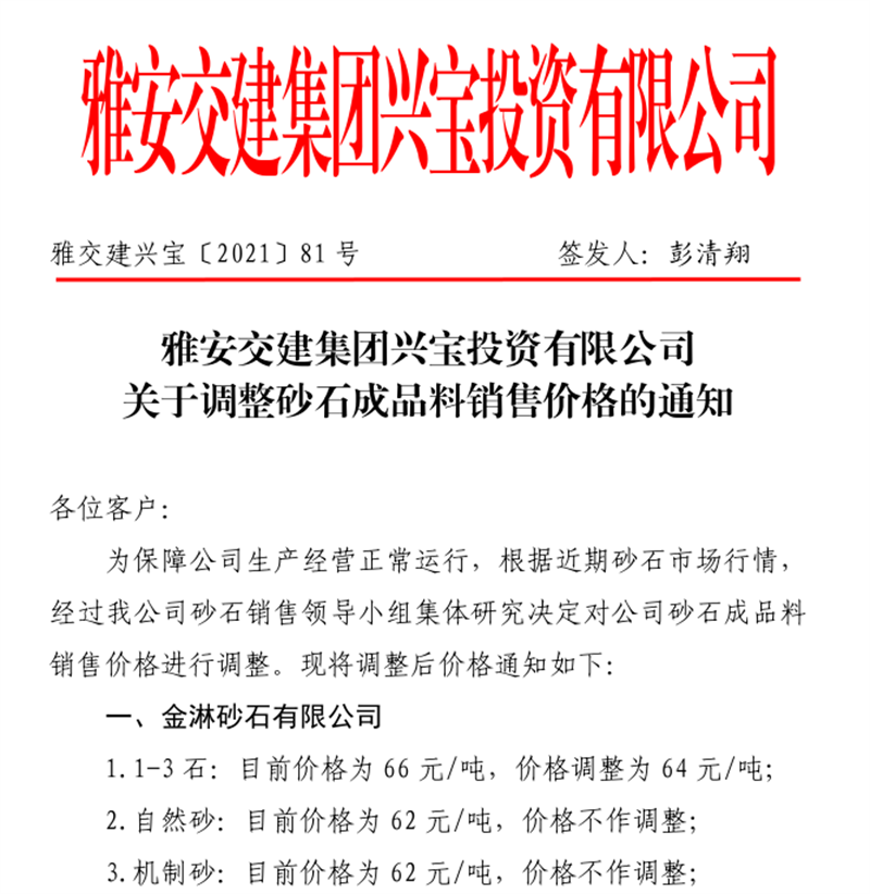 雅安交建集團(tuán)云石公司關(guān)于調(diào)整成品料銷售價格的通知(2021.11.4)