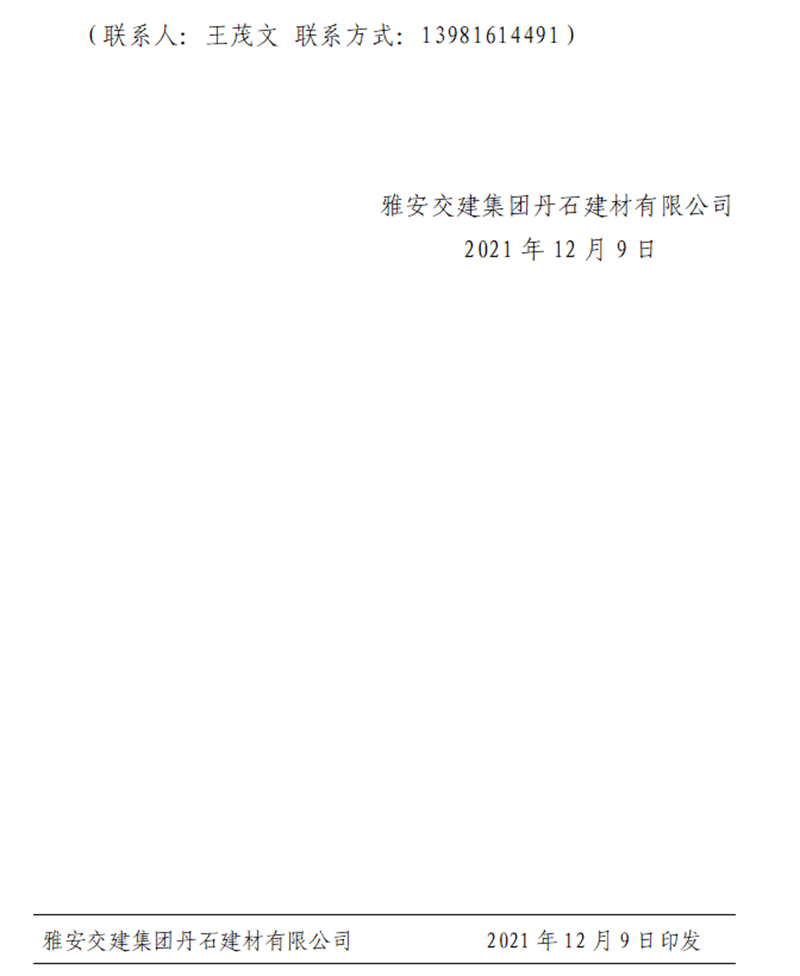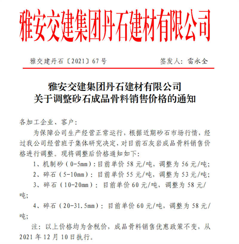 雅安交建集團(tuán)丹石公司關(guān)于調(diào)整砂石成品骨料銷售價格的通知(2021.12.9)