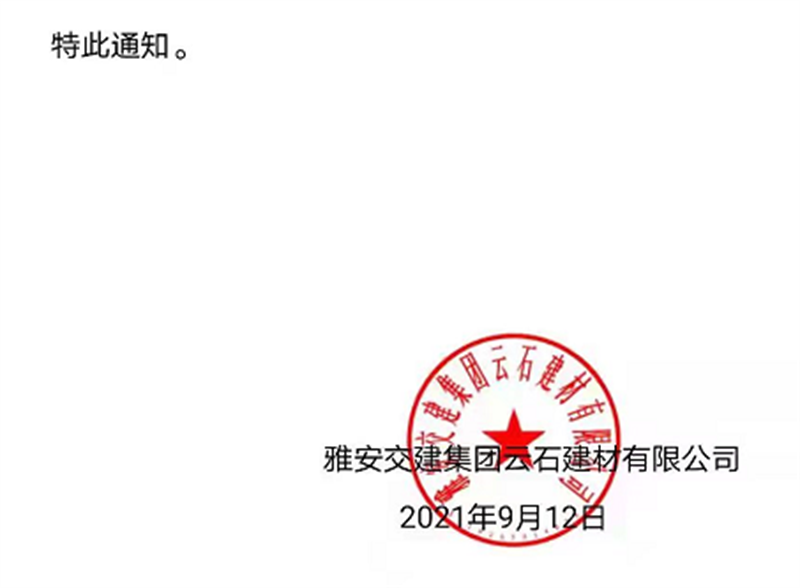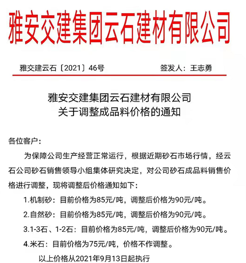 雅安交建集團云石公司關于調(diào)整成品料銷售價格的通知(2021.9.13)