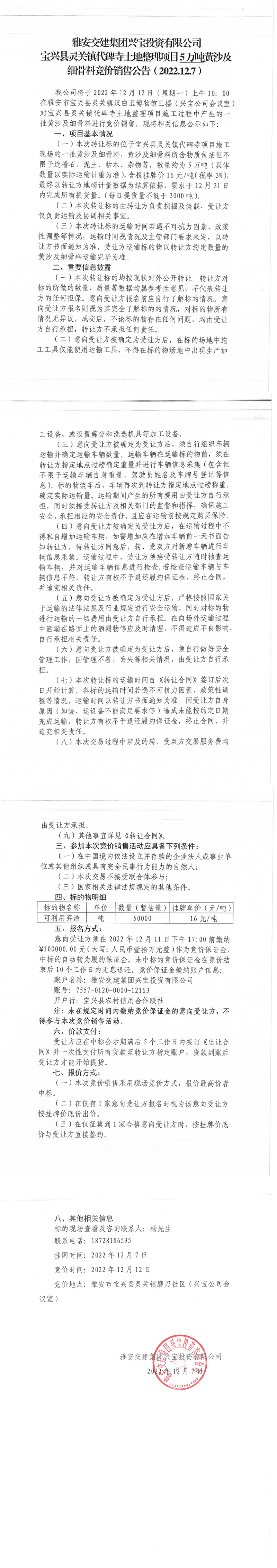 雅安交建集團(tuán)興寶投資有限公司寶興縣靈關(guān)鎮(zhèn)代碑寺土地整理項(xiàng)目5萬噸黃沙及細(xì)骨料競價(jià)銷售成交公告(2022-12-12)