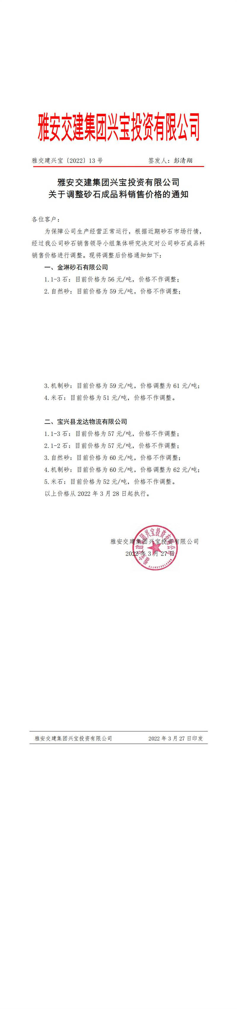 雅交建興寶〔2022〕13號 關(guān)于調(diào)整砂石成品料銷售價格的通知-3月27日