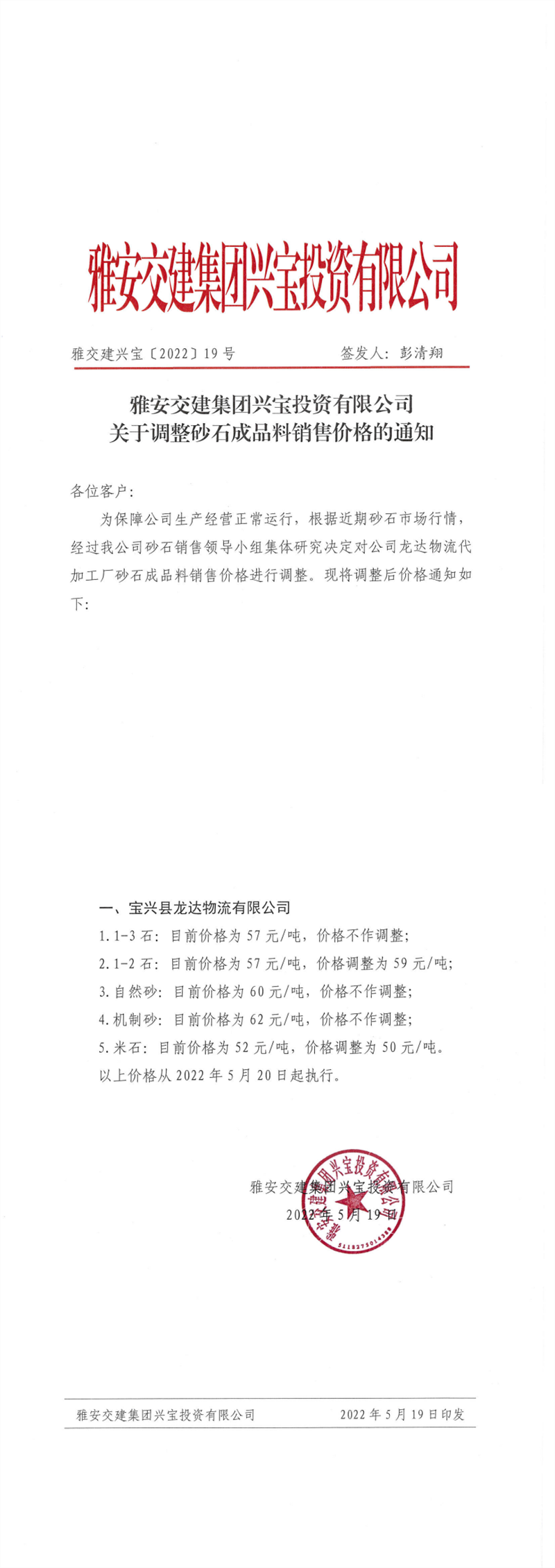 ÑŰ²½»½¨¼¯ˆFÔÆÊ¯½¨²ÄÓÐÏÞ¹«Ë¾ êP(gu¨¡n)ÓÚÕ{(di¨¤o)Õû³ÉÆ·Áσr¸ñµÄ֪ͨ--2022-5-25