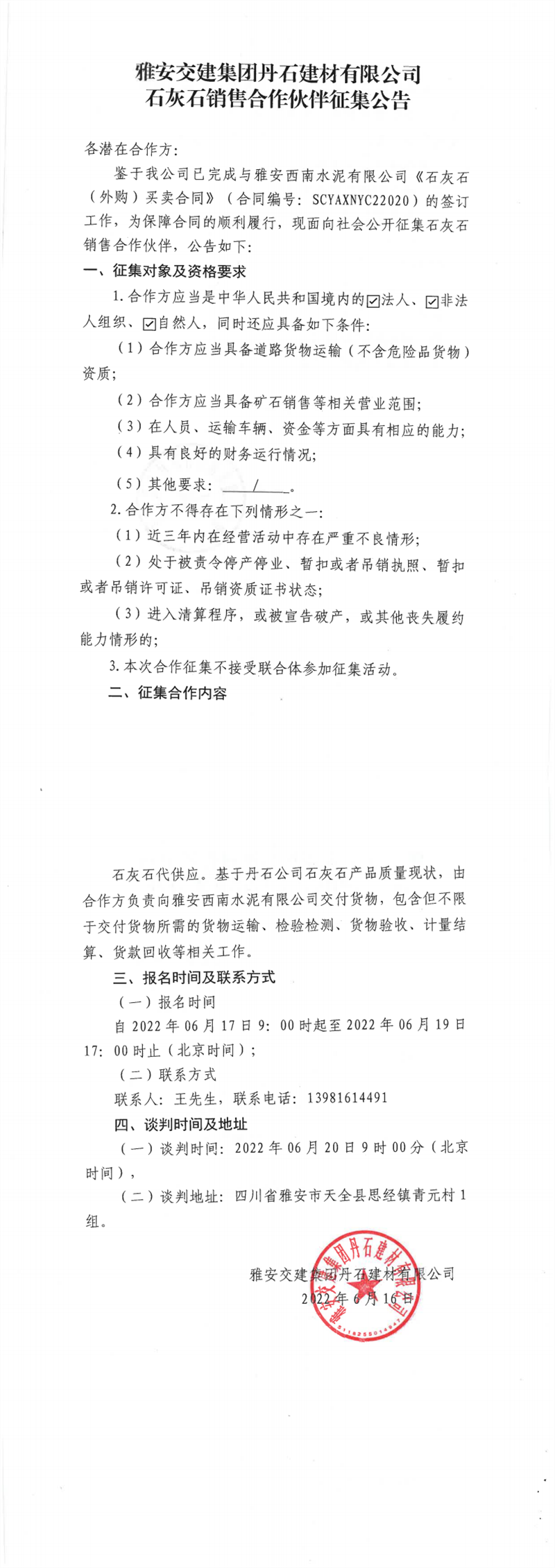 雅安交建集團丹石建材有限公司石灰石銷售合作伙伴征集公告6-16