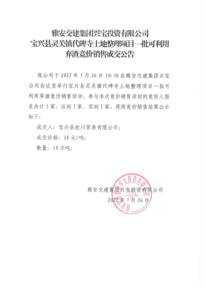 寶興縣靈關(guān)鎮(zhèn)代碑寺土地整理項(xiàng)目一批可利用棄渣競(jìng)價(jià)銷售成交公告7.26(5萬噸)