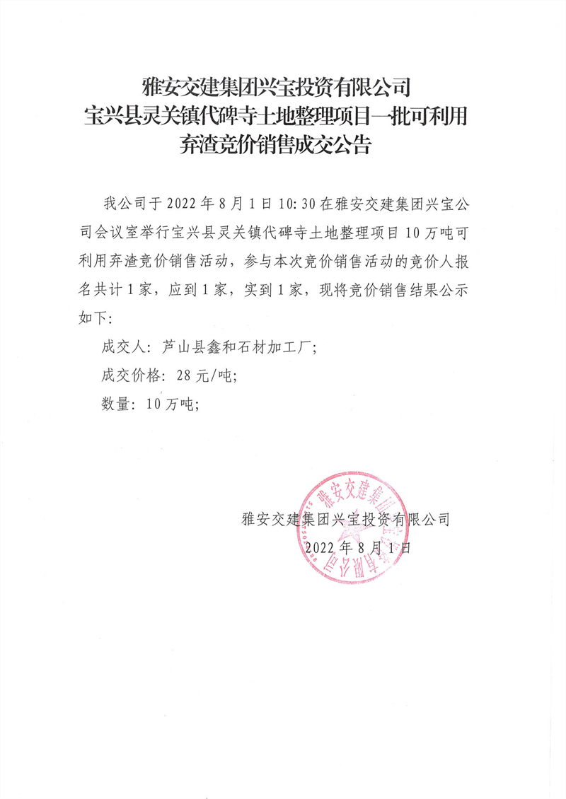 雅安交建集團(tuán)興寶投資有限公司靈關(guān)鎮(zhèn)代碑寺土地整理項(xiàng)目5萬(wàn)噸可利用棄渣競(jìng)價(jià)銷售成交公告(2022.8.1)