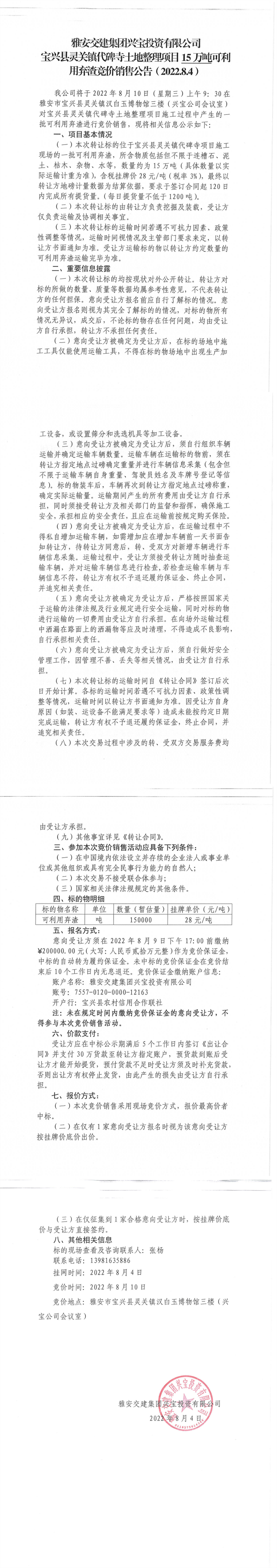 雅安交建集團(tuán)興寶投資有限公司靈關(guān)鎮(zhèn)代碑寺土地整理項(xiàng)目15萬(wàn)噸可利用棄渣競(jìng)價(jià)銷(xiāo)售公告(2022.8.4)