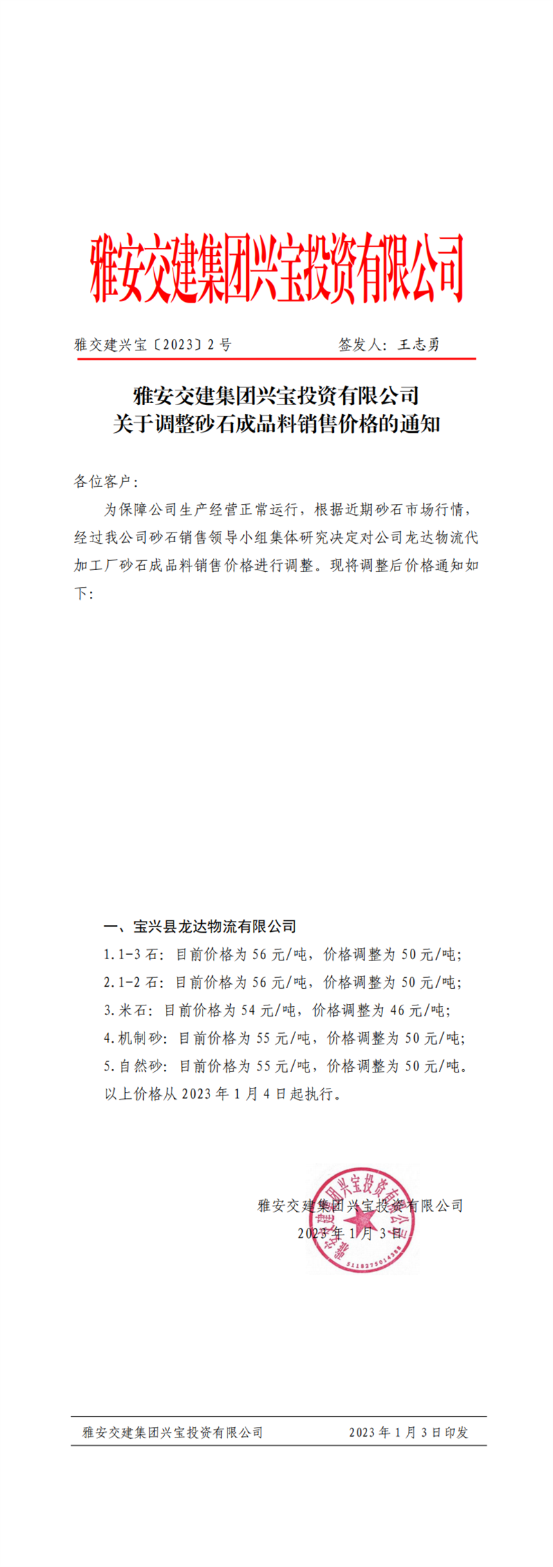 雅交建興寶〔2023〕2號 關于調(diào)整砂石成品料銷售價格的通知-2023-01-03