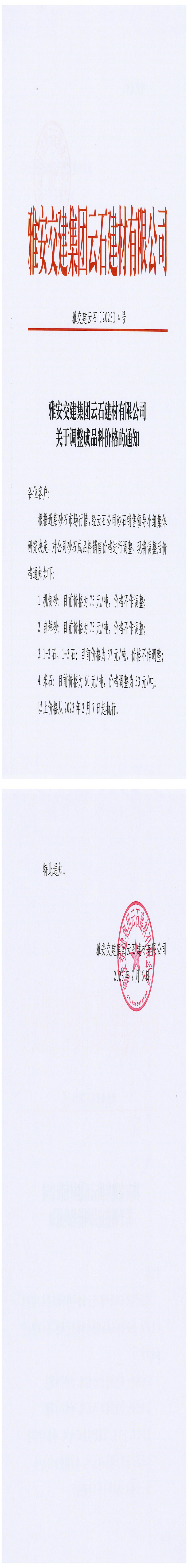 雅安交建集團云石建材有限公司關于調(diào)整成品料價格的通知-2023-02-06
