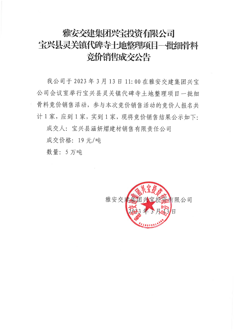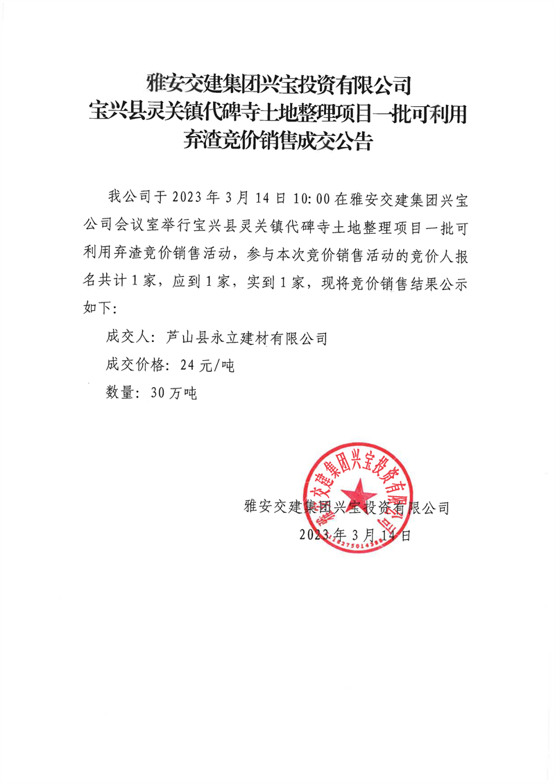 雅安交建集團(tuán)興寶投資有限公司30萬噸可利用棄渣競(jìng)價(jià)銷售成交公告、5萬噸細(xì)骨料竟價(jià)成效公告(2023.3.14)