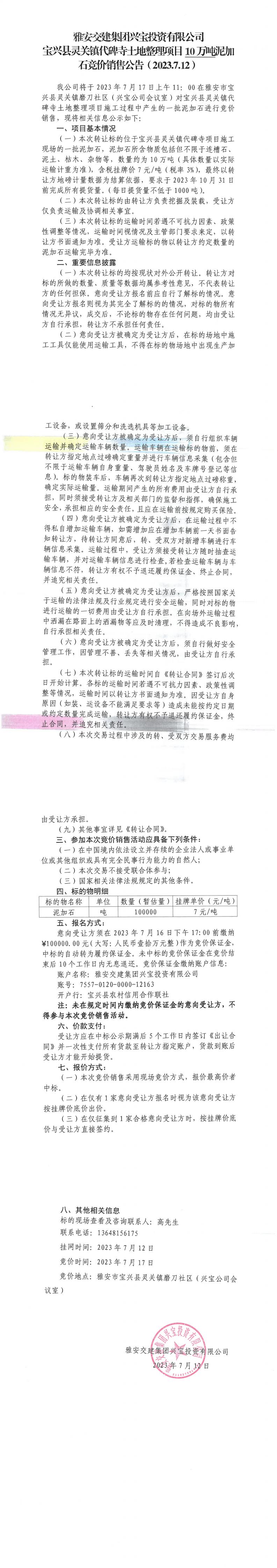 雅安交建集團(tuán)興寶投資有限公司寶興縣靈關(guān)鎮(zhèn)代碑寺土地整理項(xiàng)目10萬噸泥加石競(jìng)價(jià)銷售公告(2023.7.12)