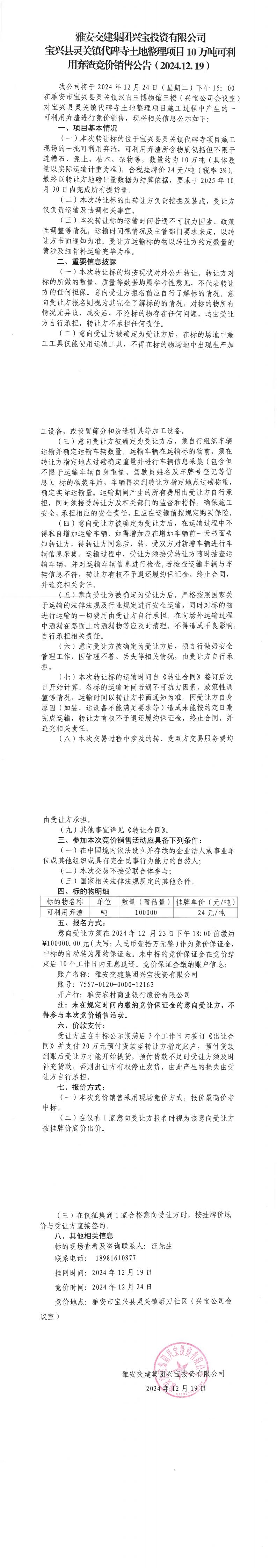 雅安交建集團(tuán)興寶投資有限公司靈關(guān)鎮(zhèn)代碑寺土地整理項(xiàng)目10萬噸可利用棄渣競價銷售公告(2024.12.19)
