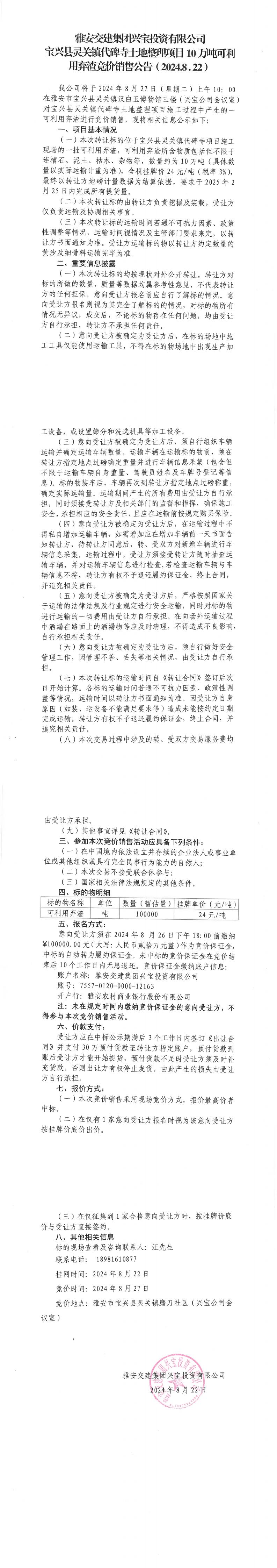 雅安交建集團(tuán)興寶投資有限公司寶興縣靈關(guān)鎮(zhèn)代碑寺土地整理項(xiàng)目10萬(wàn)噸可利用棄渣競(jìng)價(jià)銷(xiāo)售公告(2024-8-22)_0